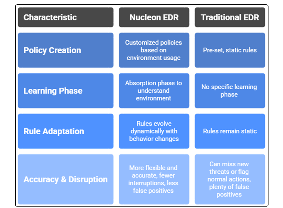 In contrast to Nucleon’s adaptive strategy, numerous traditional EDR solutions depend on pre-defined rules that remain unchanged with respect to your specific environment. These static systems operate using generic configurations or signature-based detection, which often fail to recognize emerging threats or mistakenly flag regular actions as suspicious, leading to interruptions.
