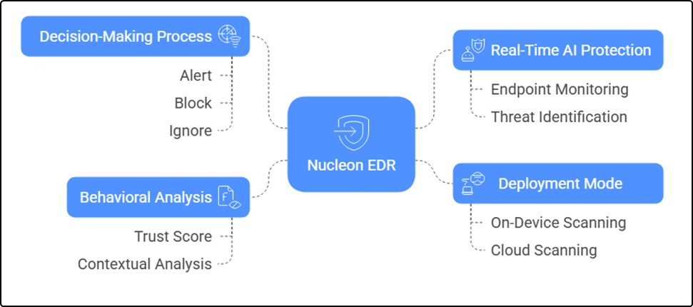 Such real-time enforcement is critical for detecting advanced attacks, such as zero-day exploits, which conventional systems might miss. By examining the file itself rather than merely comparing it to a set list of known threats, the AI can uncover malicious code and prevent the file from inflicting harm. This additional layer of security guarantees that even newly developed threats are identified swiftly. Nucleon’s EDR is crafted to facilitate this process smoothly, providing rapid, intelligent protection that secures your endpoints without hindering your productivity.
