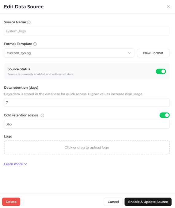 Nucleon XDR impose l’association d’un Format Template à chaque source pour garantir un parsing cohérent et une normalisation homogène des événements. La configuration se fait depuis la console, avec activation/désactivation de la source et paramétrage associé.